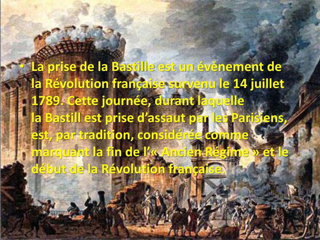 La prise de la Bastille est un évènement de la Révolution française survenu le 14 juillet 1789. Cette journée, durant laquelle la Bastill est prise d’assaut par les Parisiens, est, par tradition, considérée comme marquant la fin de l’« Ancien Régime» et le début de la Révolution française.