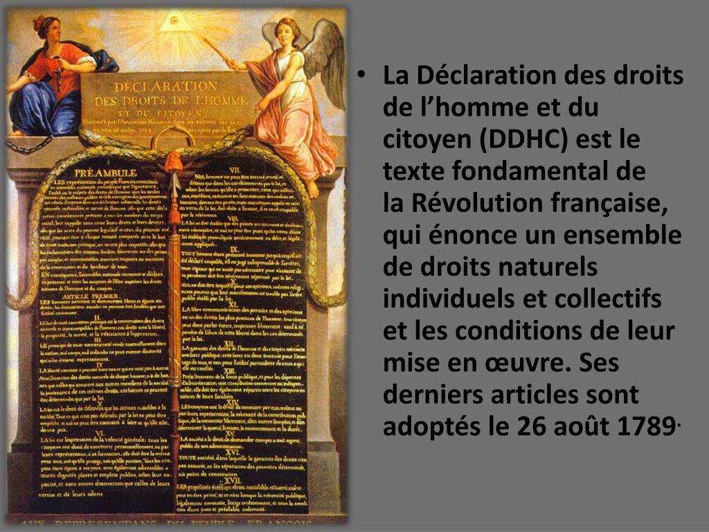 La Déclaration des droits de l’homme et du citoyen (DDHC) est le texte fondamental de la Révolution française, qui énonce un ensemble de droitsnaturelsindividuels et collectifs et les conditions de leur mise en œuvre. Ses derniers articles sont adoptés le 26 août 1789.