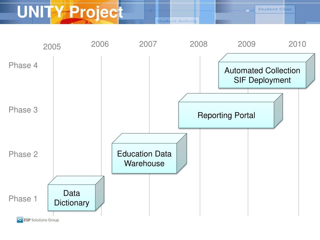 UNITY Project 2006 2007 2008 2009 2010 2005 Automated Collection SIF Deployment Phase 4 Reporting Portal Phase 3 Education Data Warehouse Phase 2 Data Dictionary Phase 1