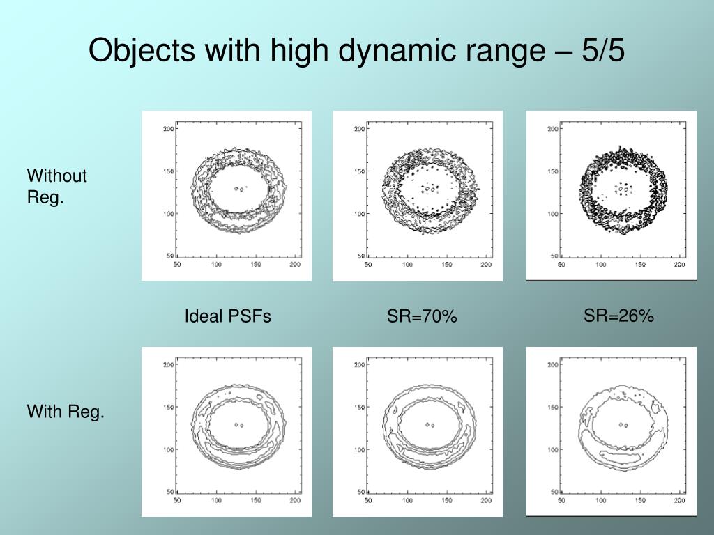 Objects with high dynamic range – 5/5 Without Reg. SR=26% Ideal PSFs SR=70% With Reg.