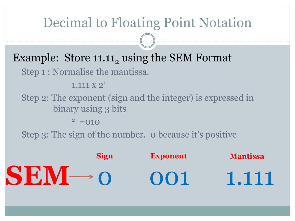 Decimal to Floating Point Notation Example: Store 11.112 using the SEM Format Step 1 : Normalise the mantissa. 1.111 x 21 Step 2: The exponent (sign and the integer) is expressed in binary using 3 bits 2 =010 Step 3: The sign of the number. 0 because it’s positive Sign Exponent Mantissa SEM • 0001 1.111