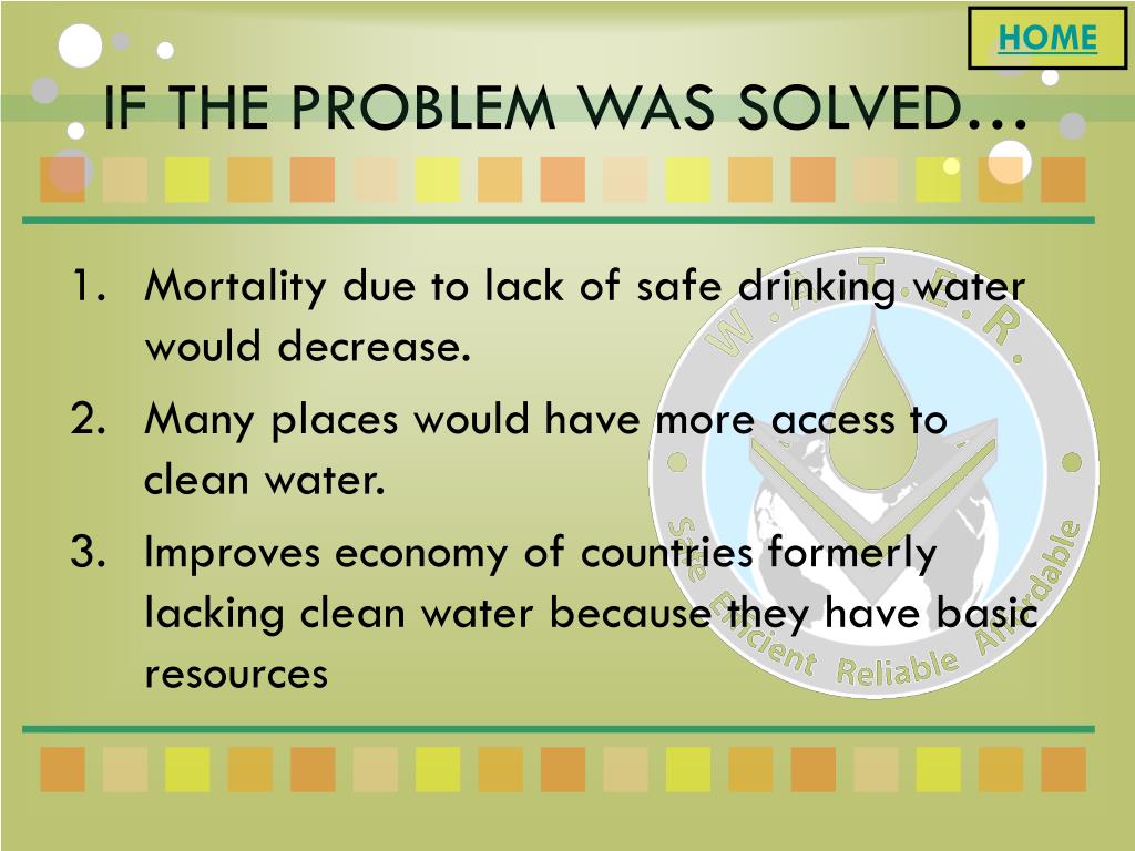 HOME IF THE PROBLEM WAS SOLVED… • Mortality due to lack of safe drinking water would decrease. • Many places would have more access to clean water. • Improves economy of countries formerly lacking clean water because they have basic resources