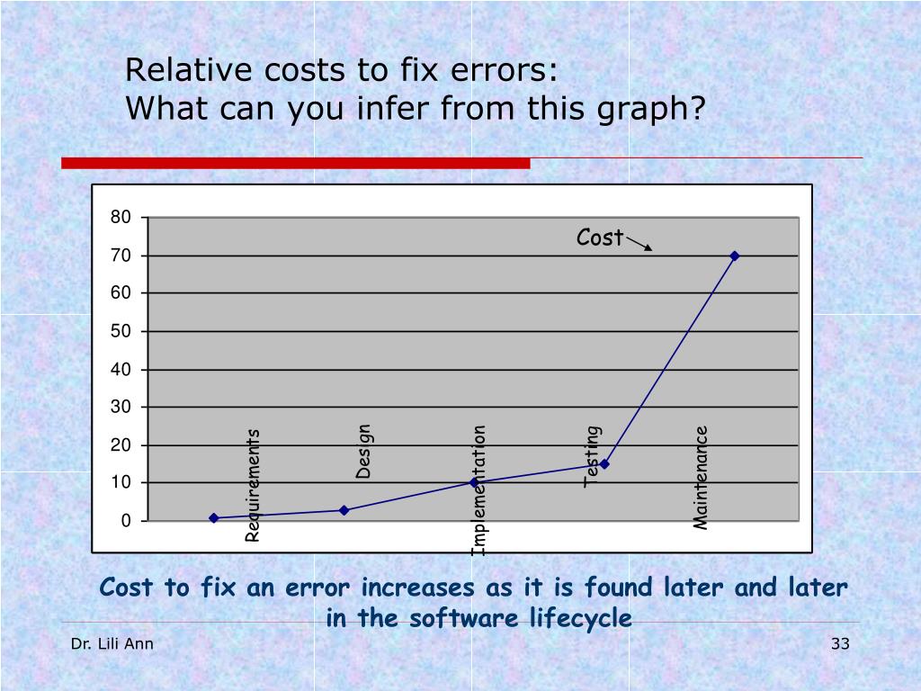 Relative costs to fix errors:What can you infer from this graph? Cost Design Testing Maintenance Requirements Implementation Cost to fix an error increases as it is found later and later in the software lifecycle