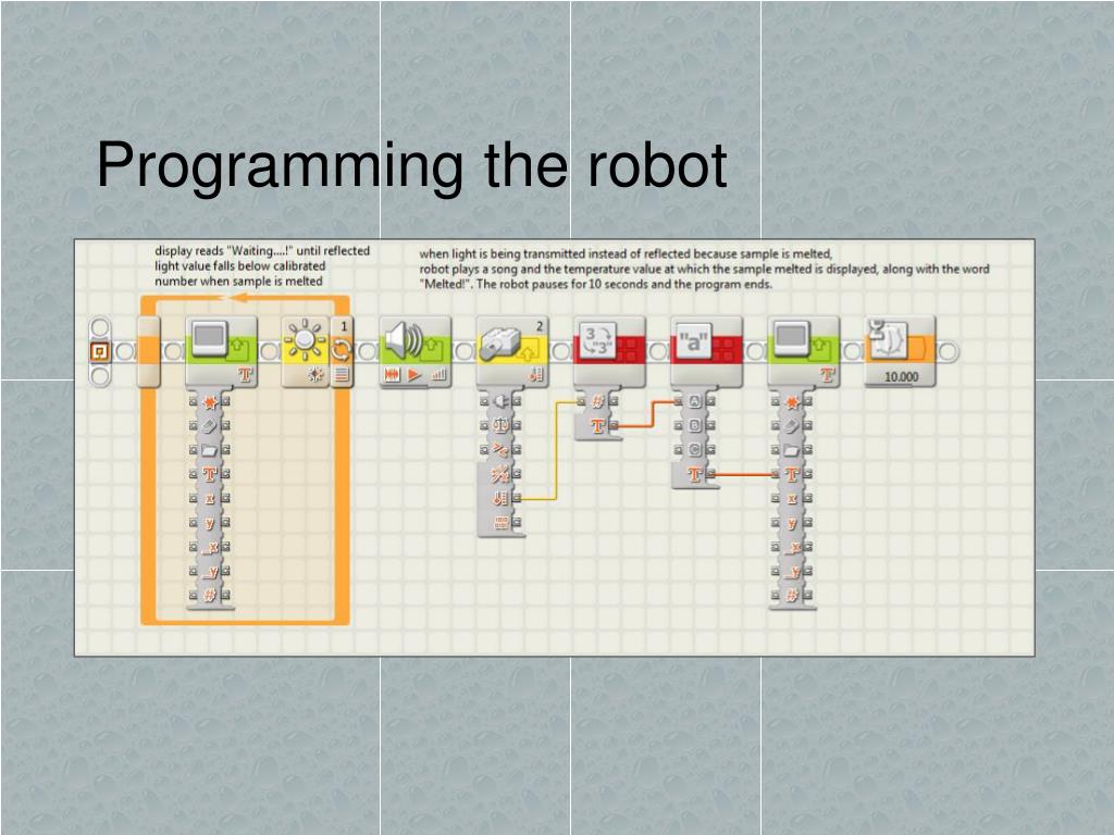 All fat is not created equal!:Aims & Scope • Through the use of robotics, this activity teaches how physical properties of food are related to their chemical structures • Lesson aims include: • define what is meant by the term “melting point” and how it is related to chemical composition in fats • construct a Lego robot to perform a specific type of measurement • understand the basics of Lego MINDSTORMS Education NXT programming software and be able to implement it using Lego robots • understand how certain properties, such as melting point, can be determined through the measurement of others, such as translucency, of a material • The main learning goal of the lesson is to provide students with the tools necessary to make educated choices on the fats they eat