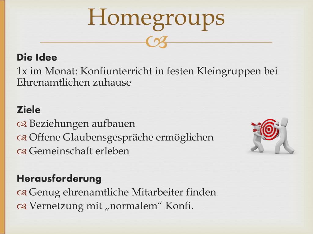 Homegroups Die Idee 1x im Monat: Konfiunterricht in festen Kleingruppen bei Ehrenamtlichen zuhause Ziele Beziehungen aufbauen Offene Glaubensgespräche ermöglichen Gemeinschaft erleben Herausforderung Genug ehrenamtliche Mitarbeiter finden Vernetzung mit „normalem“ Konfi.