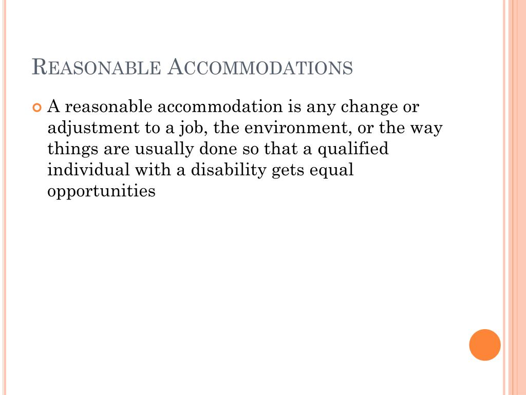 Reasonable Accommodations • A reasonable accommodation is any change or adjustment to a job, the environment, or the way things are usually done so that a qualified individual with a disability gets equal opportunities