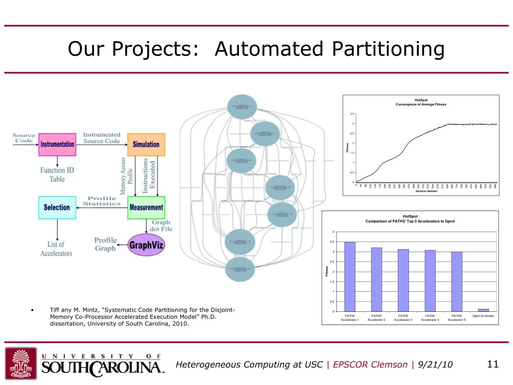 Our Projects: Automated Partitioning • Tiff any M. Mintz, “Systematic Code Partitioning for the Disjoint-Memory Co-Processor Accelerated Execution Model” Ph.D. dissertation, University of South Carolina, 2010.