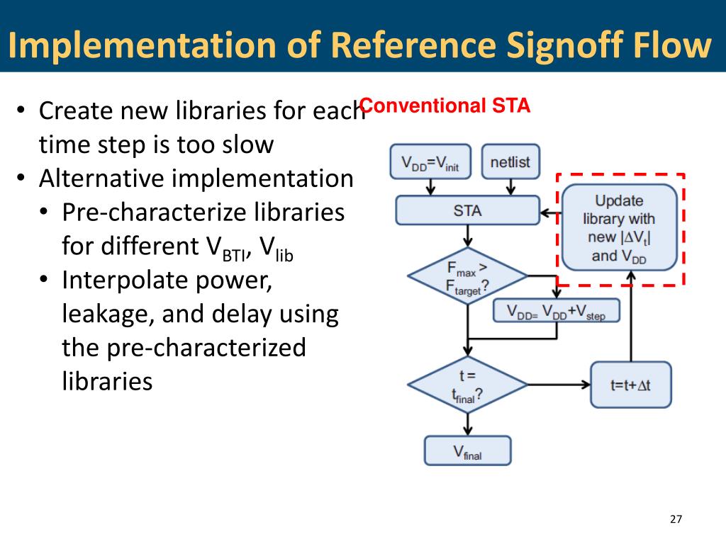 A Reference Signoff Flow • Basic idea: keep a consistent VBTI , VLIB and Vdd throughout circuit lifetime • Signoff flow: • Estimate aging at each time step • Update circuit timing and Vdd • Repeat until t = tfinal • Modify circuit and start over if Vfinal > maximum allowed voltage • No overhead in timing analysis, but very slow Many STA runs and library Vstep: AVS voltage step Vfinal: converged voltage