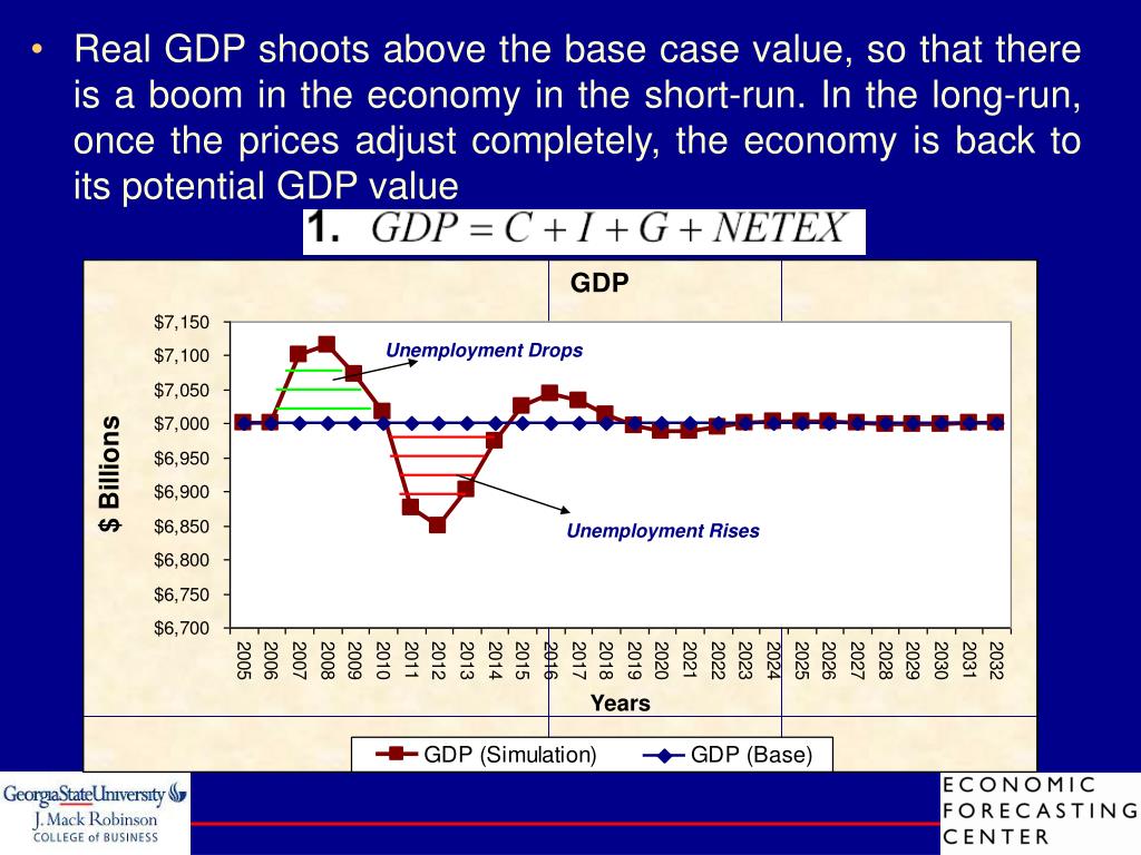 Real GDP shoots above the base case values, so that there is a boom in the economy in the short-run. In the long-run, once the prices adjust completely, the economy is back to its potential GDP Unemployment Drops Unemployment Rises