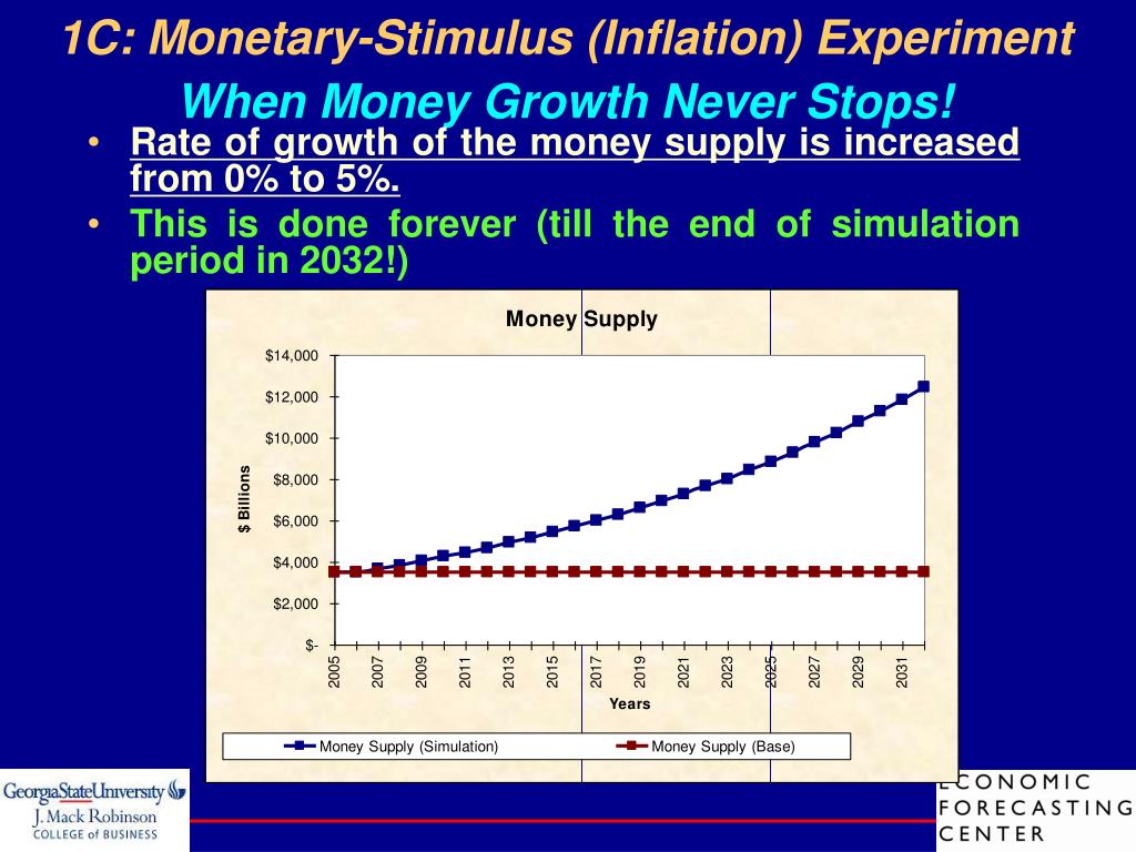 1C: Monetary-Stimulus (Inflation) Experiment When Money Growth Never Stops! • Rate of growth of the money supply is increased from 0% to 5%. • This is done forever (till the end of simulation period in 2032!)