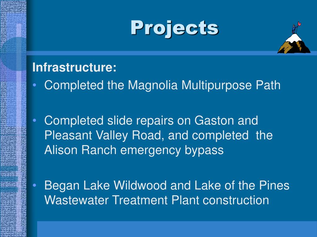 Projects Infrastructure: • Completed the Magnolia Multipurpose Path • Completed slide repairs on Gaston and Pleasant Valley Road, and completed the Alison Ranch emergency bypass • Began Lake Wildwood and Lake of the Pines Wastewater Treatment Plant construction