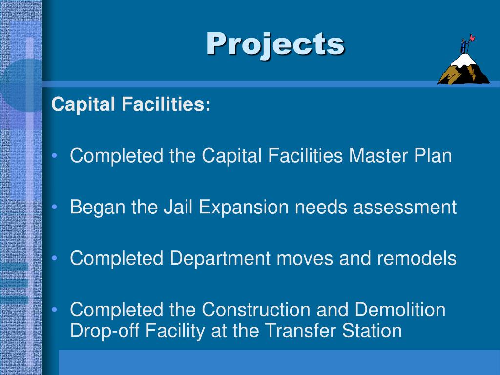 Projects Capital Facilities: • Completed the Capital Facilities Master Plan • Began the Jail Expansion needs assessment • Completed Department moves and remodels • Completed the Construction and Demolition Drop-off Facility at the Transfer Station