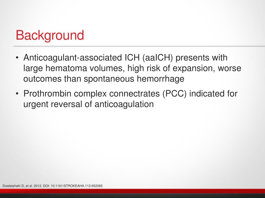 Background • Anticoagulant-associated ICH (aaICH) presents with large hematoma volumes, high risk of expansion, worse outcomes than spontaneous hemorrhage • Prothrombin complex connectrates (PCC) indicated for urgent reversal of anticoagulation Dowlatshahi D, et al. 2012. DOI: 10.1161/STROKEAHA.112.652065
