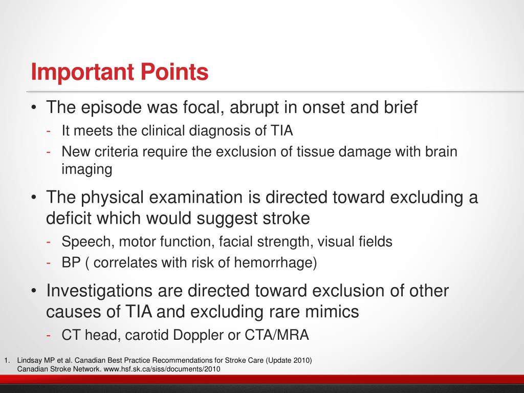 Important Points The episode was focal, abrupt in onset and brief It meets the clinical diagnosis of TIA New criteria require the exclusion of tissue damage with brain imaging The physical examination is directed toward excluding a deficit which would suggest stroke Speech, motor function, facial strength, visual fields BP ( correlates with risk of hemorrhage) Investigations are directed toward exclusion of other causes of TIA and excluding rare mimics CT head, carotid Doppler or CTA/MRA Lindsay MP et al. Canadian Best Practice Recommendations for Stroke Care (Update 2010) Canadian Stroke Network. www.hsf.sk.ca/siss/documents/2010