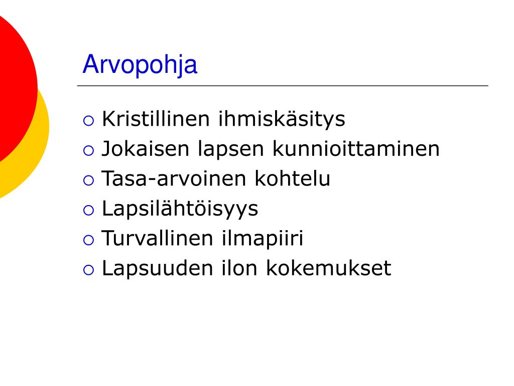Arvopohja • Kristillinen ihmiskäsitys • Jokaisen lapsen kunnioittaminen • Tasa-arvoinen kohtelu • Lapsilähtöisyys • Turvallinen ilmapiiri • Lapsuuden ilon kokemukset