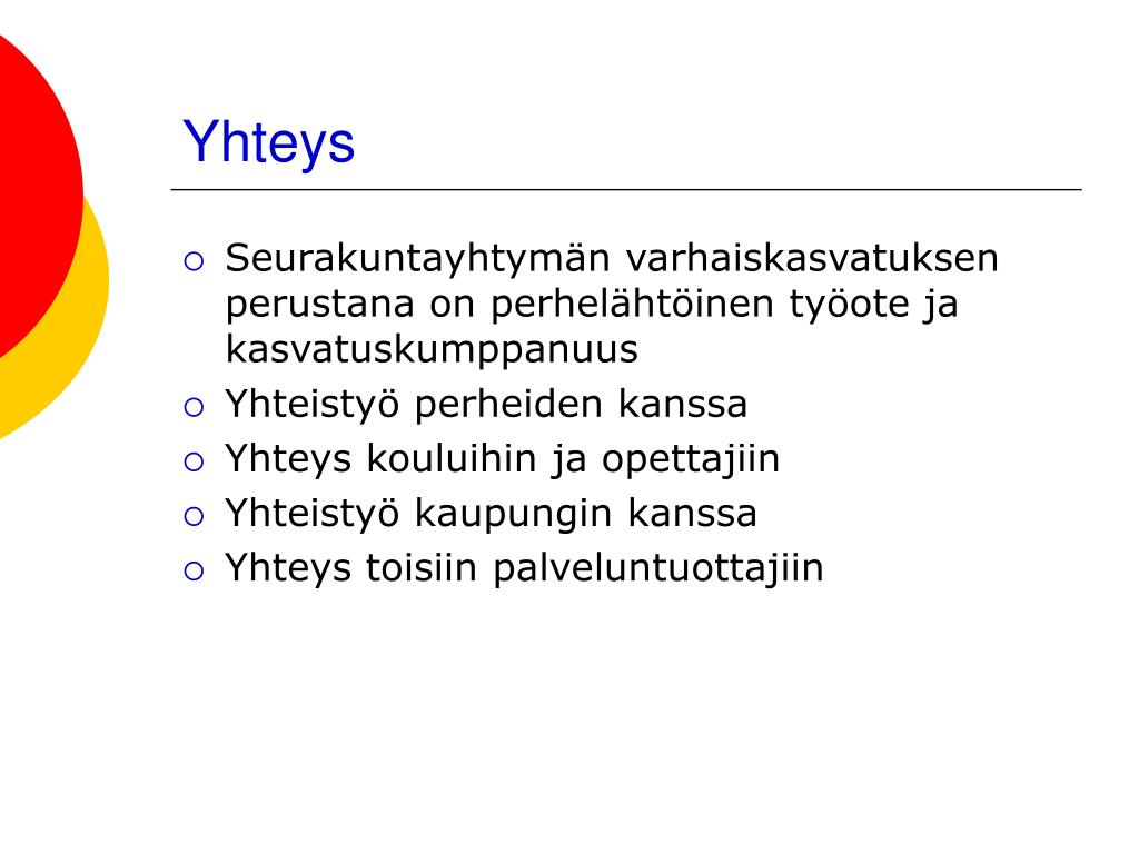 Yhteys • Seurakuntayhtymän varhaiskasvatuksen perustana on perhelähtöinen työote ja kasvatuskumppanuus • Yhteistyö perheiden kanssa • Yhteys kouluihin ja opettajiin • Yhteistyö kaupungin kanssa • Yhteys toisiin palveluntuottajiin
