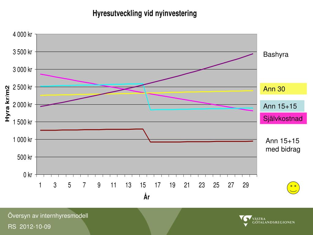 En mera rättvisande resultatbedömning Ny internhyresmodell • Den direkta kopplingen mellan självkostnad och internhyra vid investeringar upphör. • Hyran sätts efter bashyresmetoden och utan direkt koppling till verklig kostnad för det aktuella investeringsprojektet
