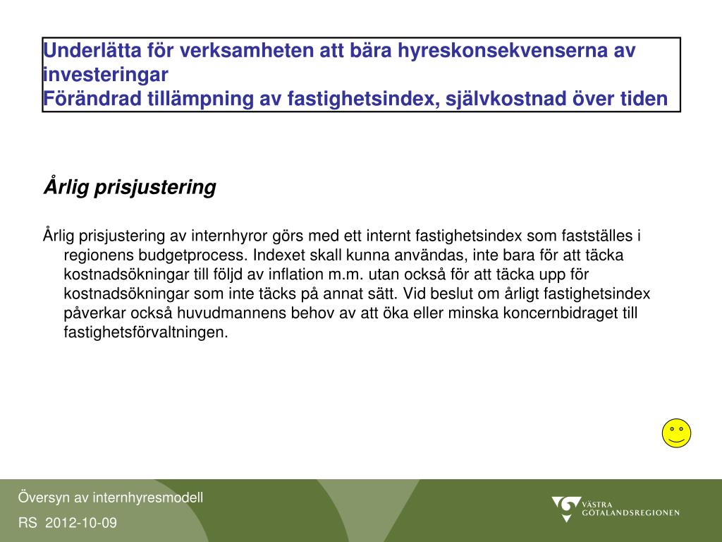 Underlätta för verksamheten att bära hyreskonsekvenserna av investeringar Förändrad tillämpning av fastighetsindex, självkostnad över tiden • Årlig prisjustering • Årlig prisjustering av internhyror görs med ett internt fastighetsindex som fastställes i regionens budgetprocess. Indexet skall kunna användas, inte bara för att täcka kostnadsökningar till följd av inflation m.m. utan också för att täcka upp för kostnadsökningar som inte täcks på annat sätt. Vid beslut om årligt fastighetsindex påverkar också huvudmannens behov av att öka eller minska koncernbidraget till fastighetsförvaltningen.