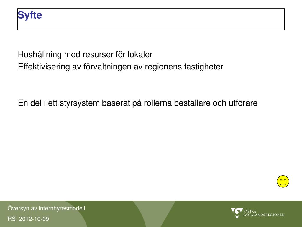 Översyn av internhyresmodell 2012-10-09. Syfte. Hushållning med resurser för lokaler Effektivisering av förvaltningen av regionens fastigheter En del i ett styrsystem baserat på rollerna beställare och utförare. Vad vi vill åstadkomma med översynen av hyresmodellen.