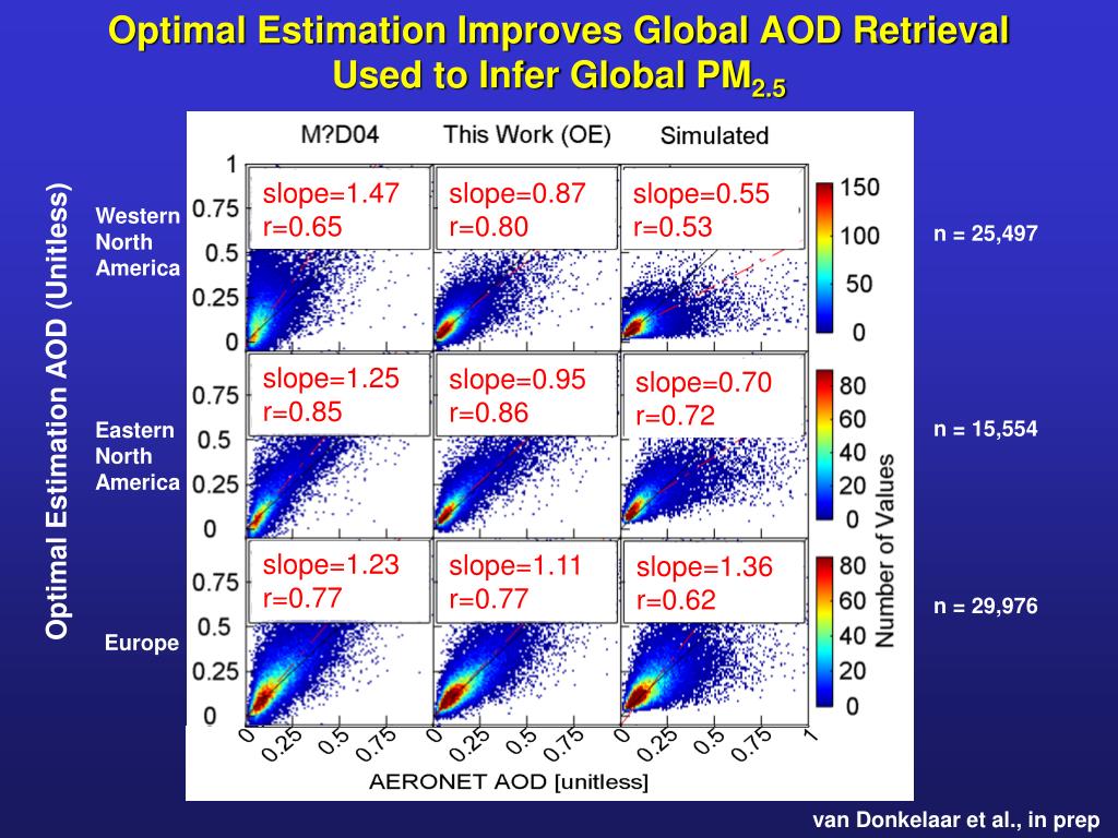 Optimal Estimation Improves Global AOD Retrieval Used to Infer Global PM2.5 slope=1.47 r=0.65 slope=0.87 r=0.80 slope=0.55 r=0.53 Western North America n = 25,497 slope=1.25 r=0.85 slope=0.95 r=0.86 slope=0.70 r=0.72 Optimal Estimation AOD (Unitless) n = 15,554 Eastern North America slope=1.23 r=0.77 slope=1.11 r=0.77 slope=1.36 r=0.62 n = 29,976 Europe van Donkelaar et al., in prep