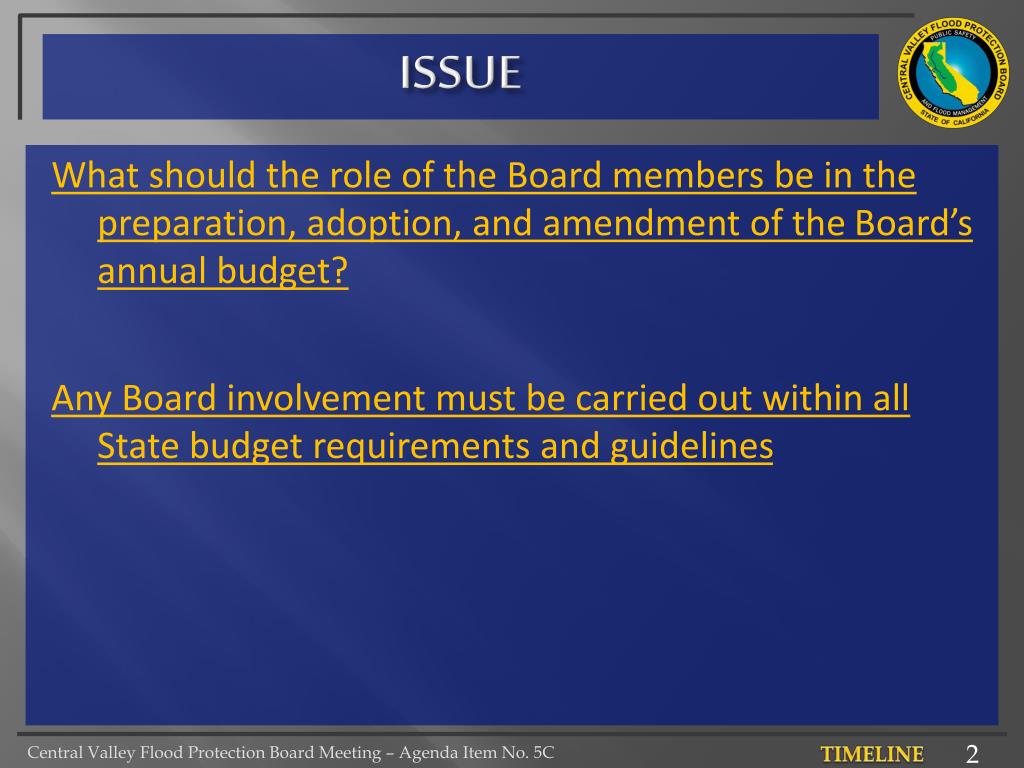 Central Valley Flood Protection Board. Informational Briefing Agenda item 5c Concept to Involve the Board more Actively in the Annual Budget Process January 10, 2014. ISSUE.
