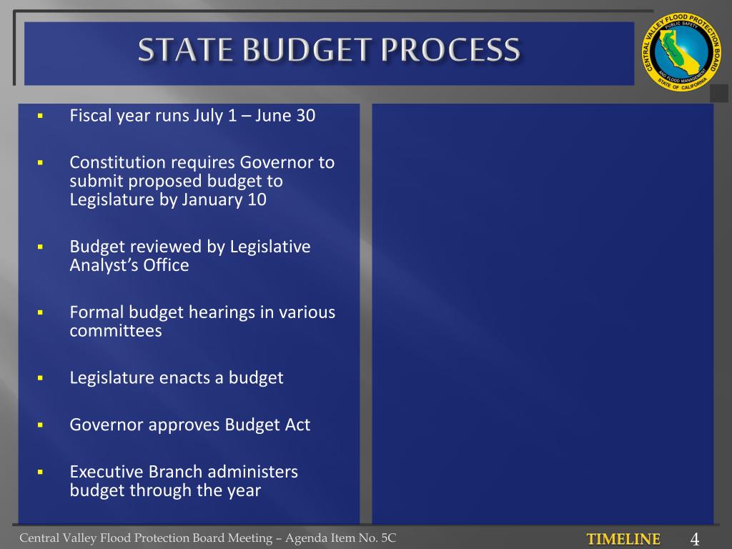 HISTORY In recent years: • Board staff submits proposed changes in baseline budget to DWR Budget Office • DWR Budget Office review • DWR Executive Management review • Natural Resources Agency review • Department of Finance review for final approval • Staff implements approved changes