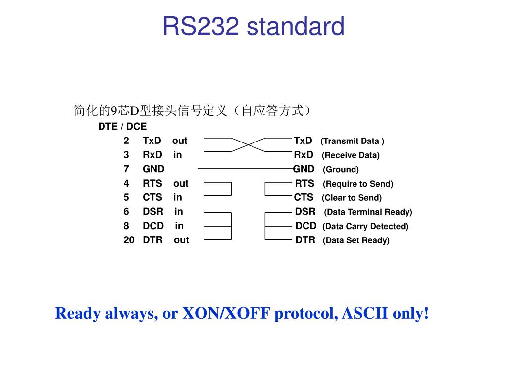 RS232 standard • 简化的9芯D型接头信号定义(无应答方式) • 1 protection ground • 2 RxD in RxD (Receive Data) • 3 TxD out TxD (Transmit Data ) • 5 GND GND (Ground) • 6 DSR in DSR (Data Terminal Ready) • 7 RTS out RTS (Require to Send) • 8 CTS in CTS (Clear to Send) • 9 DCD in DCD (Data Carrier Detected) • 4 DTR out DTR (Data Set Ready) No Handshake, should use XON/XOFF protocol,ASCII only