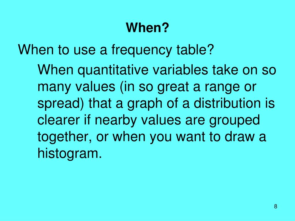 When? When to use a frequency table? When quantitative variables take on so many values (in so great a range or spread) that a graph of a distribution is clearer if nearby values are grouped together, or when you want to draw a histogram.