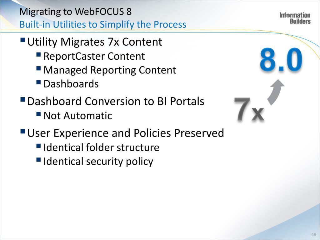 Migrating to WebFOCUS 8Built-in Utilities to Simplify the Process • Utility Migrates 7x Content • ReportCaster Content • Managed Reporting Content • Dashboards • Dashboard Conversion to BI Portals • Not Automatic • User Experience and Policies Preserved • Identical folder structure • Identical security policy 8.0 7x