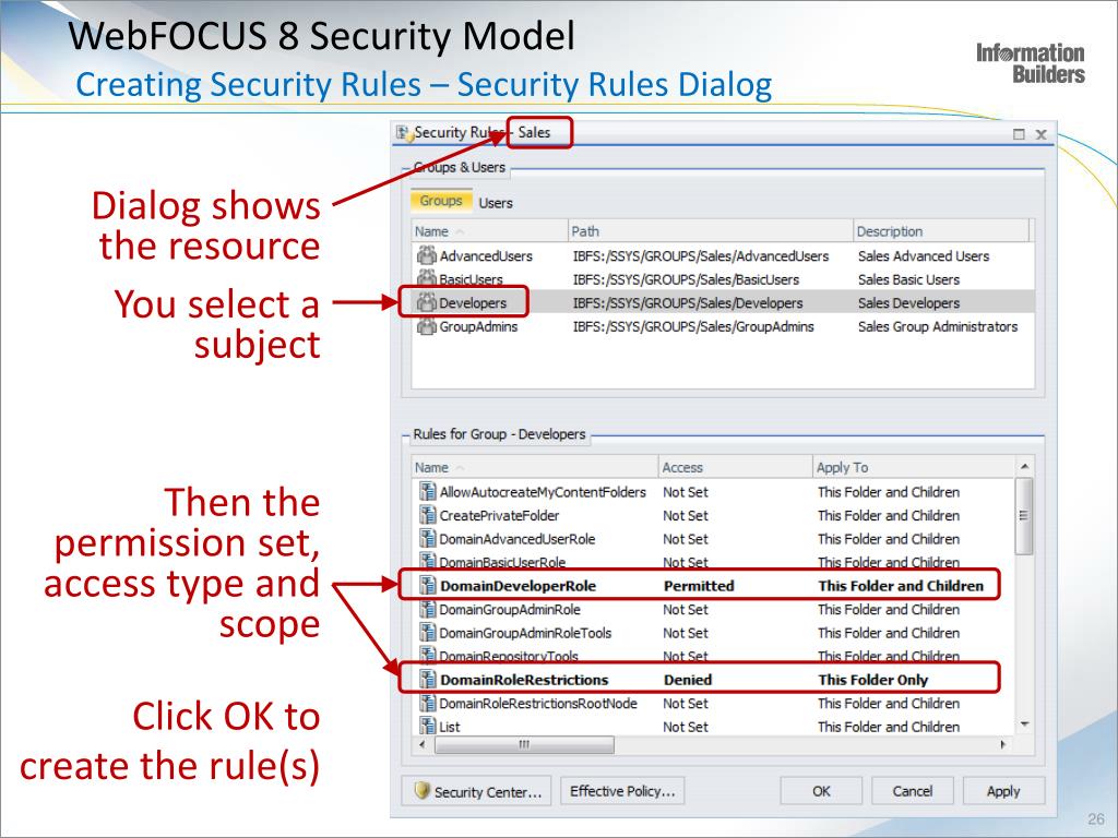 WebFOCUS 8 Security ModelCreating Security Rules – Security Rules Dialog Dialog shows the resource You select a subject Then the permission set, access type and scope Click OK to create the rule(s)