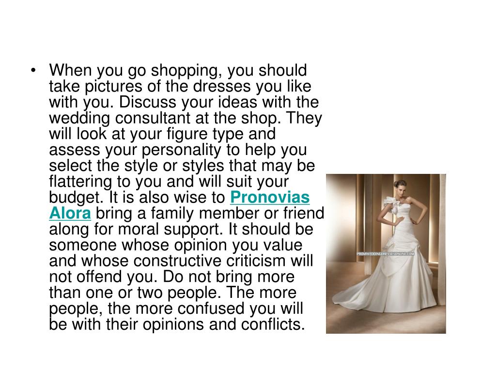 When you go shopping, you should take pictures of the dresses you like with you. Discuss your ideas with the wedding consultant at the shop. They will look at your figure type and assess your personality to help you select the style or styles that may be flattering to you and will suit your budget. It is also wise to Pronovias Alora bring a family member or friend along for moral support. It should be someone whose opinion you value and whose constructive criticism will not offend you. Do not bring more than one or two people. The more people, the more confused you will be with their opinions and conflicts.