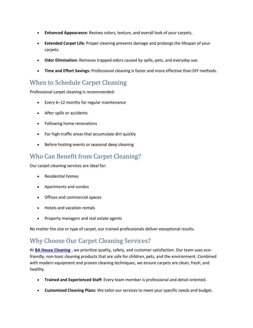 2. Enhanced Appearance: Revives colors, texture, and overall look of your carpets.  Extended Carpet Life: Proper cleaning prevents damage and prolongs the lifespan of your carpets.  Odor Elimination: Removes trapped odors caused by spills, pets, and everyday use.  Time and Effort Savings: Professional cleaning is faster and more effective than DIY methods. When to Schedule Carpet Cleaning Professional carpet cleaning is recommended:  Every 6–12 months for regular maintenance  After spills or accidents  Following home renovations  For high-traffic areas that accumulate dirt quickly  Before hosting events or seasonal deep cleaning Who Can Benefit from Carpet Cleaning? Our carpet cleaning services are ideal for:  Residential homes  Apartments and condos  Offices and commercial spaces  Hotels and vacation rentals  Property managers and real estate agents No matter the size or type of carpet, our trained professionals deliver exceptional results. Why Choose Our Carpet Cleaning Services? At BA House Cleaning, we prioritize quality, safety, and customer satisfaction. Our team uses eco- friendly, non-toxic cleaning products that are safe for children, pets, and the environment. Combined with modern equipment and proven cleaning techniques, we ensure carpets are clean, fresh, and healthy.  Trained and Experienced Staff: Every team member is professional and detail-oriented.  Customized Cleaning Plans: We tailor our services to meet your specific needs and budget.