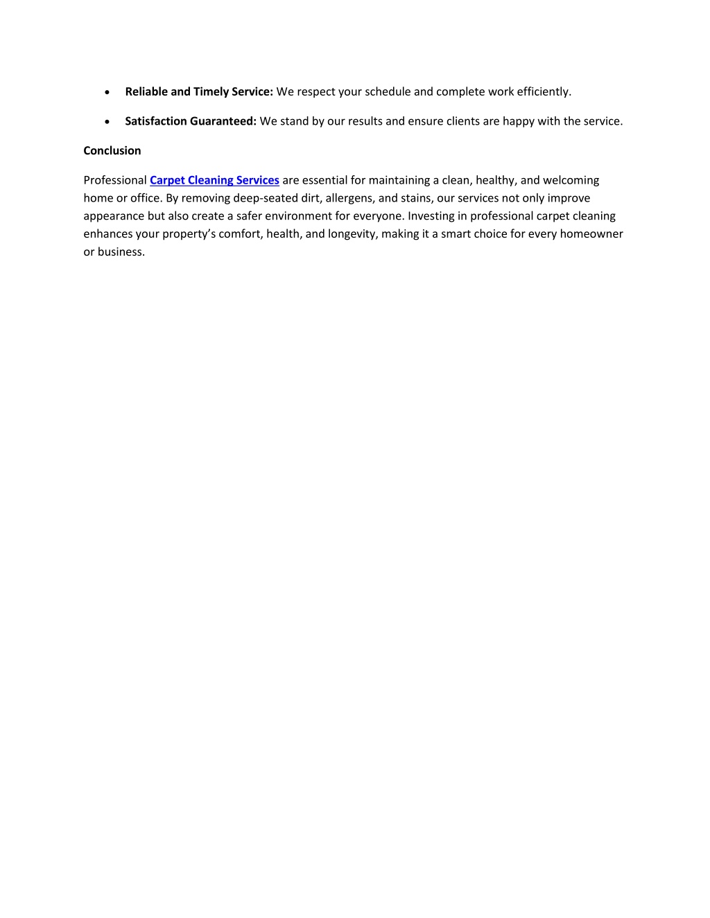 3. Reliable and Timely Service: We respect your schedule and complete work efficiently.  Satisfaction Guaranteed: We stand by our results and ensure clients are happy with the service. Conclusion Professional Carpet Cleaning Services are essential for maintaining a clean, healthy, and welcoming home or office. By removing deep-seated dirt, allergens, and stains, our services not only improve appearance but also create a safer environment for everyone. Investing in professional carpet cleaning enhances your property’s comfort, health, and longevity, making it a smart choice for every homeowner or business.