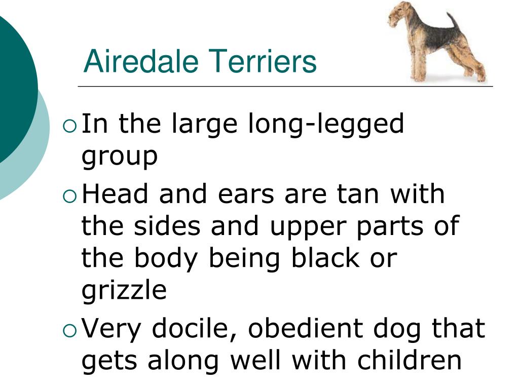 Airedale Terriers • In the large long-legged group • Head and ears are tan with the sides and upper parts of the body being black or grizzle • Very docile, obedient dog that gets along well with children