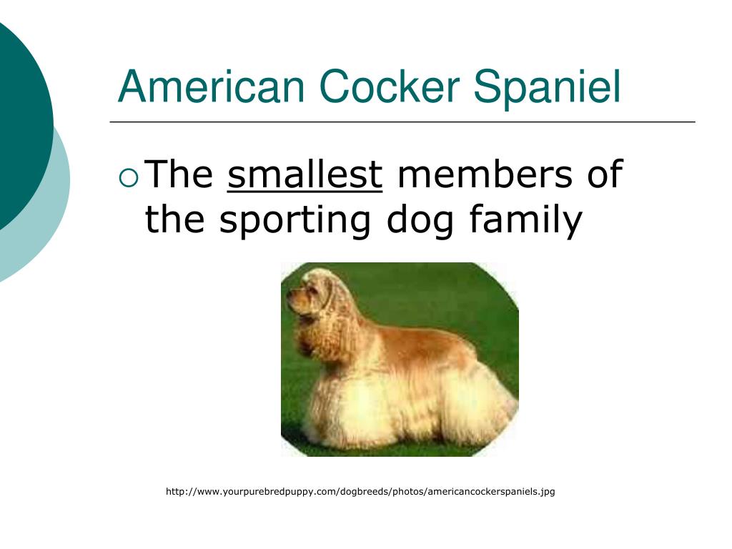 American Cocker Spaniel • The smallest members of the sporting dog family http://www.yourpurebredpuppy.com/dogbreeds/photos/americancockerspaniels.jpg