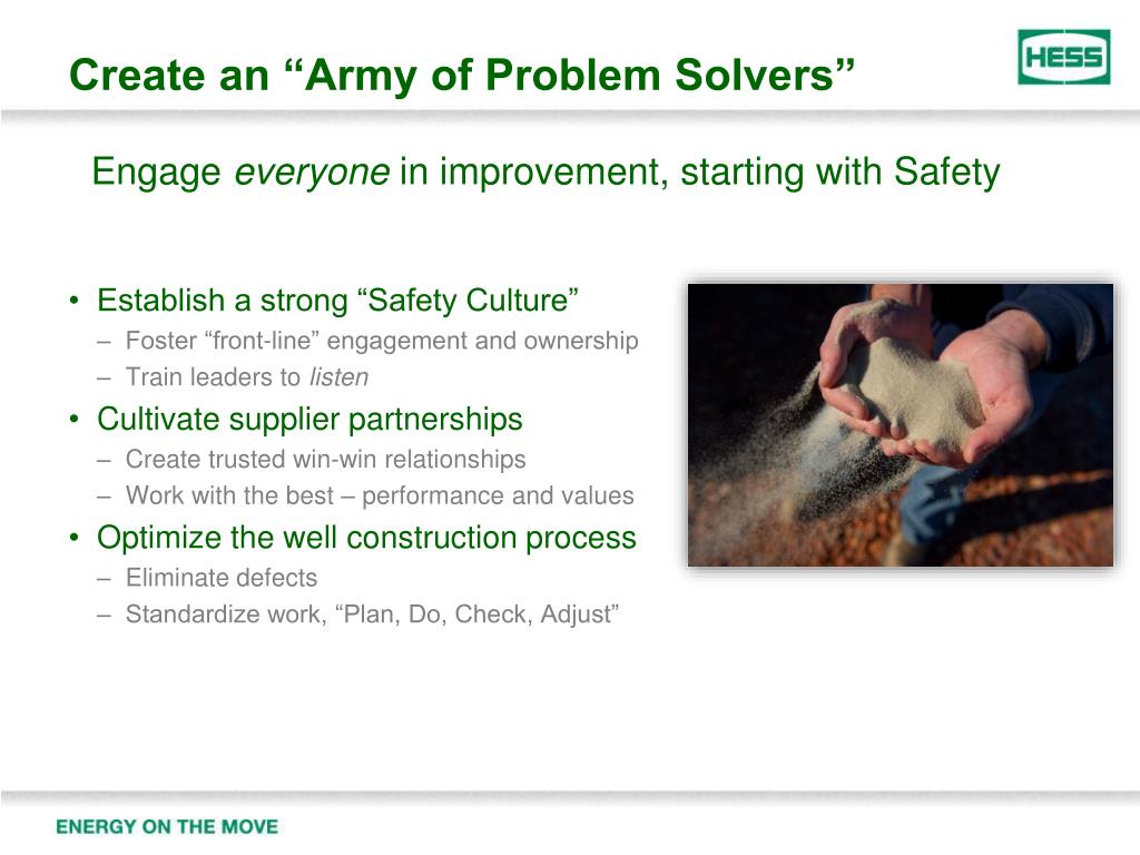 Establish a strong “Safety Culture” Foster “front-line” engagement and ownership Train leaders to listen Cultivate supplier partnerships Create trusted win-win relationships Work with the best – performance and values Optimize the well construction process Eliminate defects Standardize work, “Plan, Do, Check, Adjust” Create an “Army of Problem Solvers” Engage everyone in improvement, starting with Safety