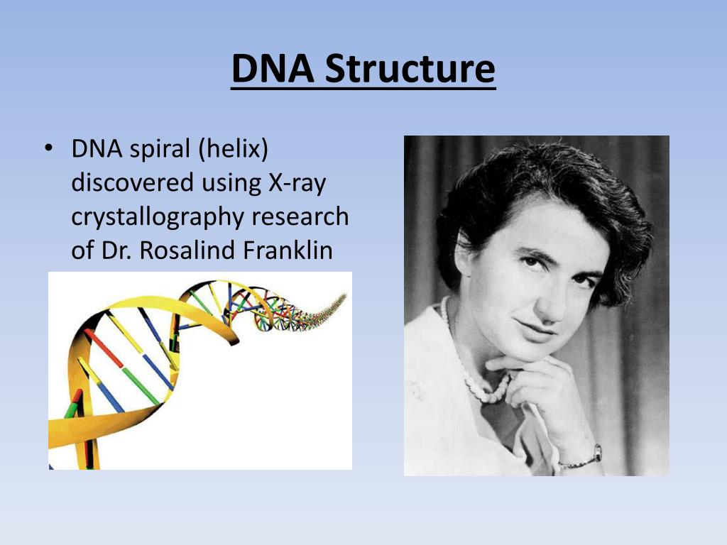 DNA Structure • DNA spiral (helix) discovered using X-ray crystallography research of Dr. Rosalind Franklin