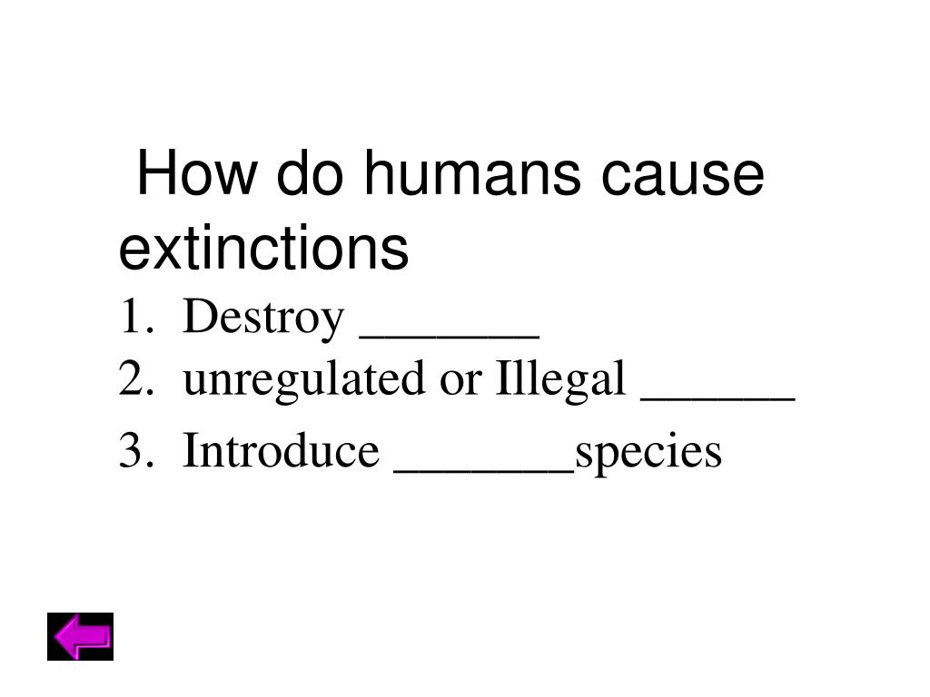 How do humans cause extinctions 1. Destroy _______ 2. unregulated or Illegal ______ 3. Introduce _______species