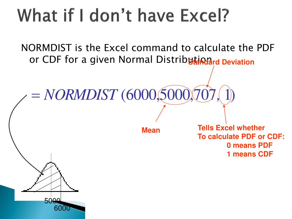 What if I don’t have Excel? NORMDIST is the Excel command to calculate the PDF or CDF for a given Normal Distribution Standard Deviation Tells Excel whether To calculate PDF or CDF: 0 means PDF 1 means CDF Mean 5000 6000