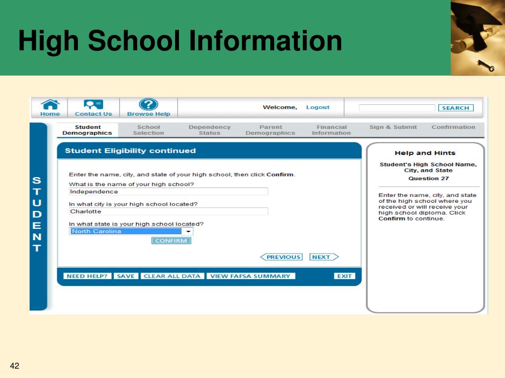ITEMS YOU NEED TO COMPLETE THE FAFSA • 2010 Federal Income Tax, if you need to file-parent and student if student is dependent • W-2 wage statements • Amount of non-taxable income such as child support received or paid • Asset information • Parent(s) and student’s social security numbers • Parent(s) date of birth