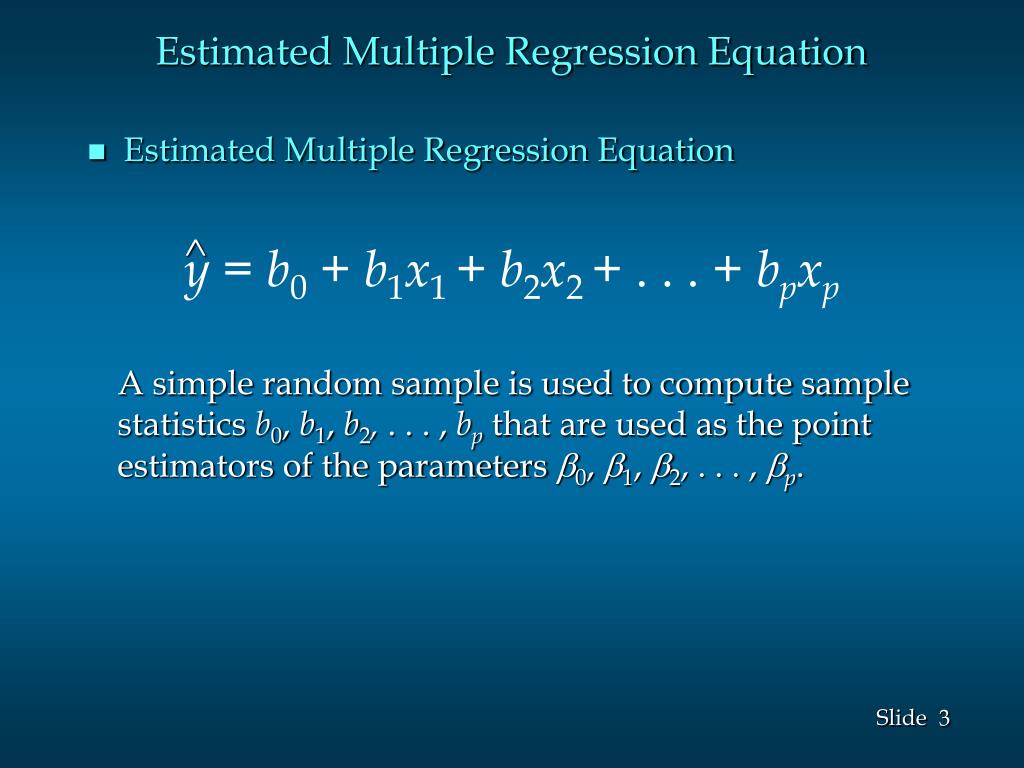 Estimated Multiple Regression Equation • Estimated Multiple Regression Equation ^ y = b0 + b1x1 + b2x2 + . . . + bpxp A simple random sample is used to compute sample statistics b0, b1, b2, . . . , bp that are used as the point estimators of the parameters b0, b1, b2, . . . , bp.