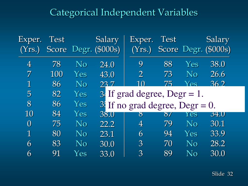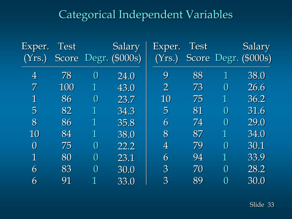 Categorical Independent Variables Exper. (Yrs.) Test Score Salary ($000s) Exper. (Yrs.) Test Score Salary ($000s) Degr. Degr. 4 7 1 5 8 10 0 1 6 6 78 100 86 82 86 84 75 80 83 91 No Yes No Yes Yes Yes No No No Yes 9 2 10 5 6 8 4 6 3 3 88 73 75 81 74 87 79 94 70 89 Yes No Yes No No Yes No Yes No No 38.0 26.6 36.2 31.6 29.0 34.0 30.1 33.9 28.2 30.0 24.0 43.0 23.7 34.3 35.8 38.0 22.2 23.1 30.0 33.0 If grad degree, Degr = 1. If no grad degree, Degr = 0.