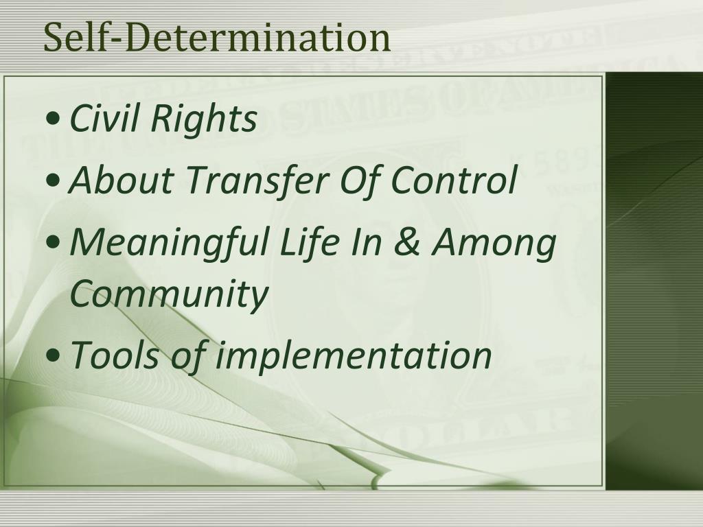 Self-Determination • Civil Rights • About Transfer Of Control • Meaningful Life In & Among Community • Tools of implementation