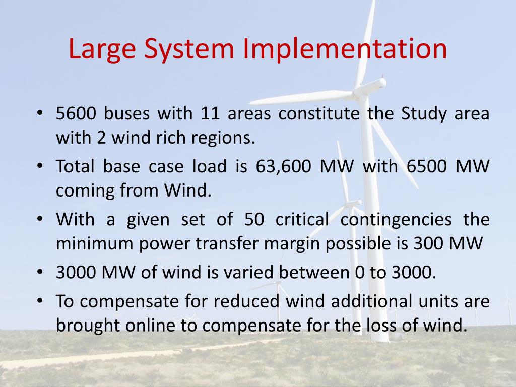Large System Implementation • 5600 buses with 11 areas constitute the Study area with 2 wind rich regions. • Total base case load is 63,600 MW with 6500 MW coming from Wind. • With a given set of 50 critical contingencies the minimum power transfer margin possible is 300 MW • 3000 MW of wind is varied between 0 to 3000. • To compensate for reduced wind additional units are brought online to compensate for the loss of wind.