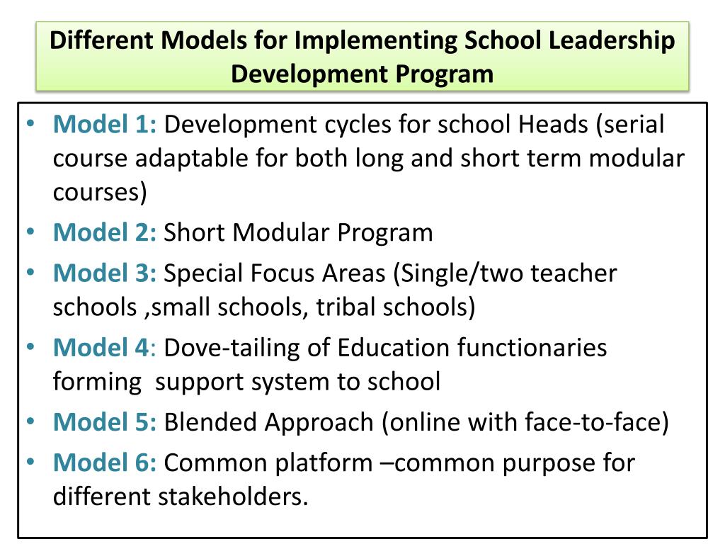 Different Models for Implementing School Leadership Development Program • Model 1: Development cycles for school Heads (serial course adaptable for both long and short term modular courses) • Model 2:Short Modular Program • Model 3:Special Focus Areas (Single/two teacher schools ,small schools, tribal schools) • Model 4: Dove-tailing of Education functionaries forming support system to school • Model 5:Blended Approach (online with face-to-face) • Model 6: Common platform –common purpose for different stakeholders.