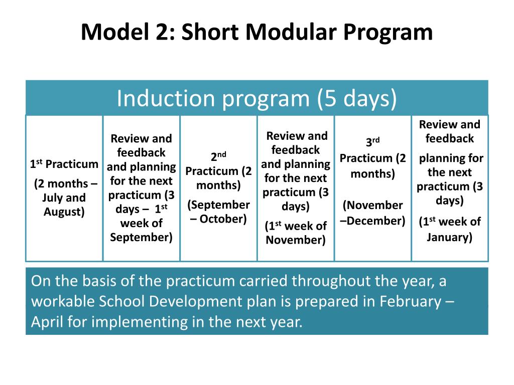 Model 2: Short Modular Program On the basis of the practicum carried throughout the year, a workable School Development plan is prepared in February – April for implementing in the next year.
