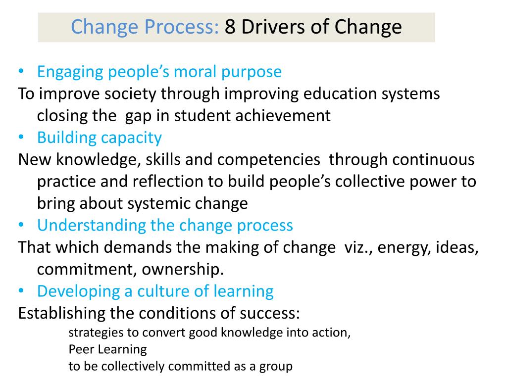 Change Process: 8 Drivers of Change • Engaging people’s moral purpose • To improve society through improving education systems closing the gap in student achievement • Building capacity • New knowledge, skills and competencies through continuous practice and reflection to build people’s collective power to bring about systemic change • Understanding the change process • That which demands the making of change viz., energy, ideas, commitment, ownership. • Developing a culture of learning • Establishing the conditions of success: • strategies to convert good knowledge into action, • Peer Learning • to be collectively committed as a group