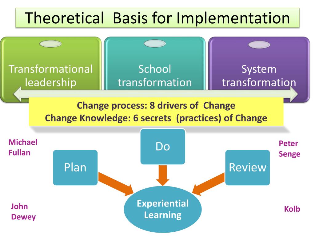 Theoretical Basis for Implementation Change process: 8 drivers of Change Change Knowledge: 6 secrets (practices) of Change Michael Fullan Peter Senge John Dewey Kolb