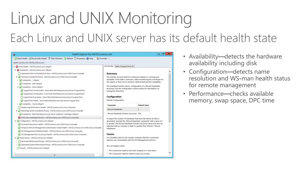 Each Linux and UNIX server has its default health state Linux and UNIX Monitoring • Availability—detects the hardware availability including disk • Configuration—detects name resolution and WS-man health status for remote management • Performance—checks available memory, swap space, DPC time