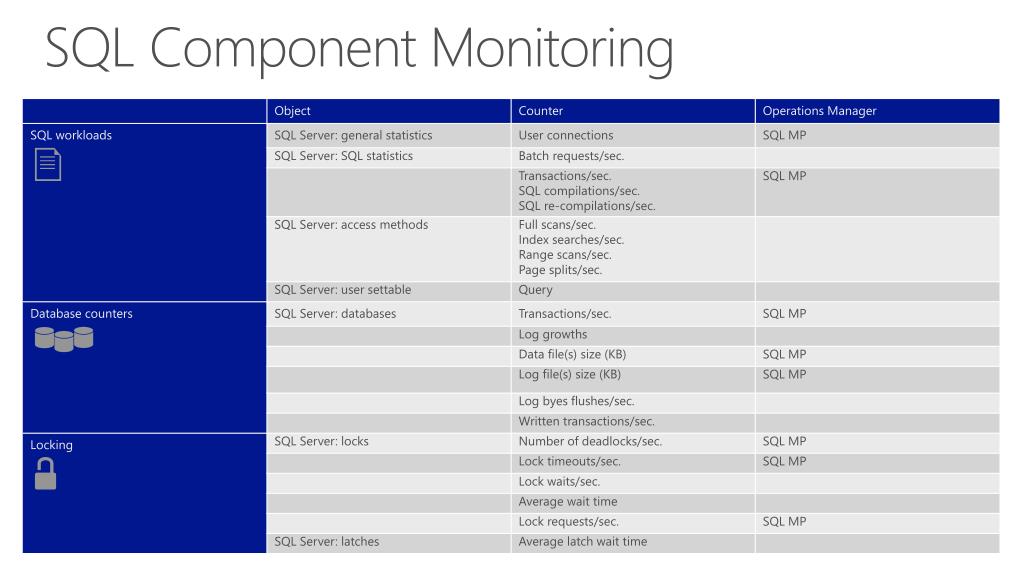 SQL Server Monitoring Discover SQL Server 2005, 2008, 2008 R2, and SQL Server 2012 Monitors SQL Server components such as database engine instances, databases, and SQL Server Agents Integrate the monitoring of SQL Server components into your service-oriented monitoring scenarios Dashboard views, diagram views, and extensive knowledge with embedded inline tasks, and views that enable near real-time diagnosis and resolution of detected issues